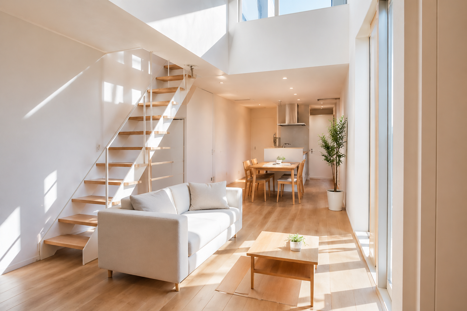 注目したいのは、空間の捉え方です。建坪わずか8.8坪という事例。数字だけ見れば、余裕のある住まいとは言い難い規模です。ところが完成した空間に足を踏み入れると、印象は一変。光に満ち、視線が抜ける。圧迫感とは無縁の室内です。秘密は、細部まで行き届いた設計の積み重ねにあります。内装は白を基調に統一。自然光や照明の反射を計算に入れ、室内全体を柔らかく包み込む仕上がりです。階段にはスケルトンタイプを採用。視界を遮らない構造が、奥行きの感覚を生み出します。面積は変えられない。だが、感じ方は変えられる——その発想の転換。都市住宅における一つの答えです。